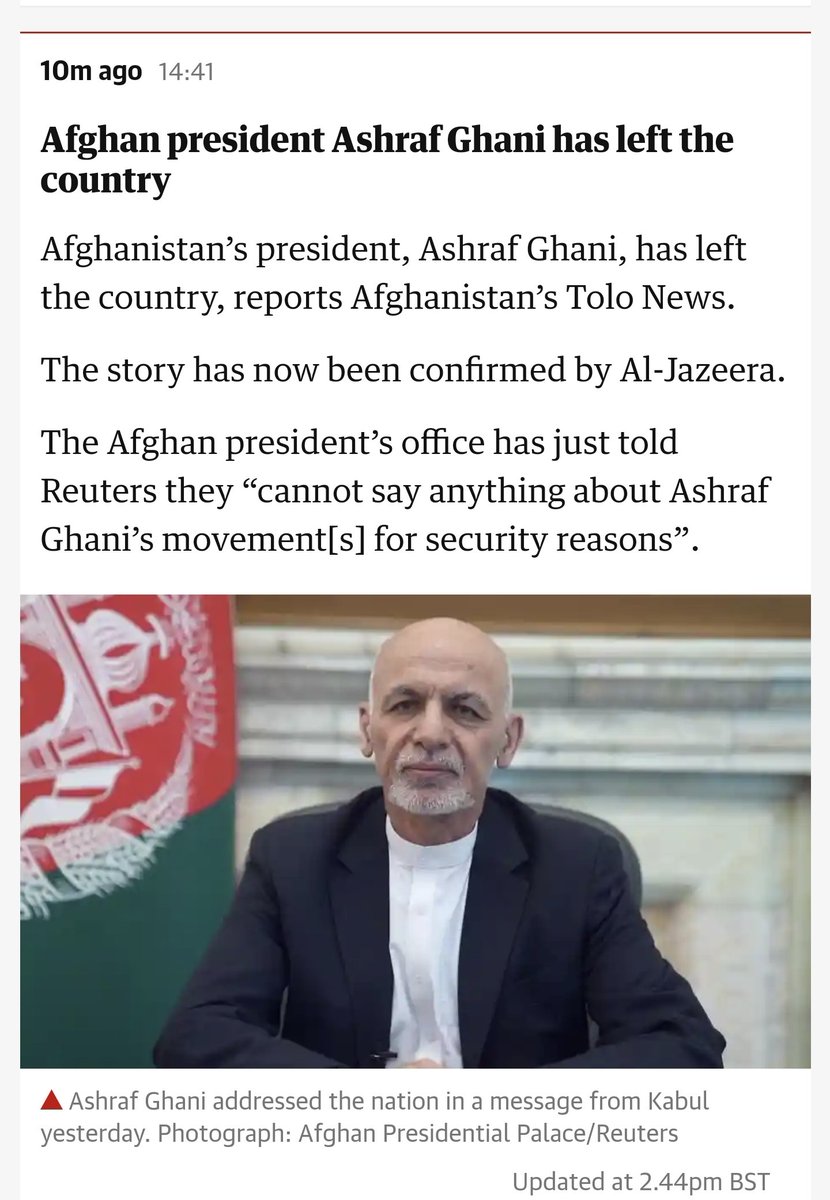 Afghan President Ashraf Ghani fled the country Sunday according to a top official as Taliban reached Kabul after a rout of government forces. When asked about Afghan President Ashraf Ghani leaving Afghanistan he said whatever has happened is because of him. I cant believe the world abandoned Afghanistan.